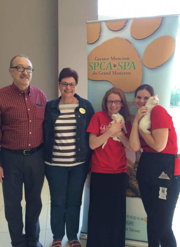 Nicole McQuade, HR Training Coordinator and Susan Maxwell, Security Officer from Casino New Brunswick (wearing red t-shirts and holding the kittens) pose with members of the Greater Moncton SPCA, and the adorable kittens that are up for adoption. On June 10, 2016, the two CNB team members sold raffle tickets for a Leanne Rimes autographed Guitar. In total, $760 was raised for the SPCA. Well done!